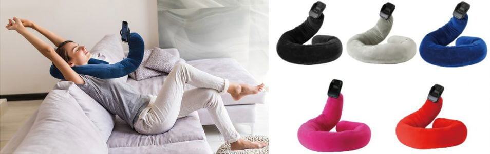 モバイルピローは、ネックピローとスマートフォンホルダーが一体化したような形状をしており、スマートフォンを空中の自由な位置に配置し、様々な姿勢で楽しむことができるユニークな商品となっています!(#^o^#)