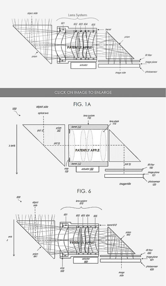 Appleが今回取得した特許名は「折りたたみカメラ」と題されたものだそうで、特許に記されたカメラは一般的にペリスコープレンズ搭載カメラと呼ばれるものと同じで、プリズムを用いて光軸を折り曲げ、レンズの移動範囲を長くし、高倍率ズームを実現しようとするものだそうです!\(^o^)/
