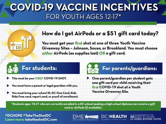 “ワシントンD.C.の12歳~17歳の若者で、Brookland MS、Sousa MS、Johnson MSのいずれかの場所で1回目のワクチン接種を受けた人は、AirPodsを受け取ることができ、25,000ドルの奨学金とiPadとヘッドホンが当たるチャンスも得られる!”とのことです!\(#^o^#)/