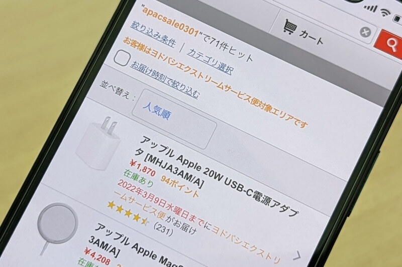 「ヨドバシ.com」のキャンペーンバナーをクリックすると「apacsale0301」の検索結果に遷移し、71件のセール対象商品が表示されるそうです!(^o^)v